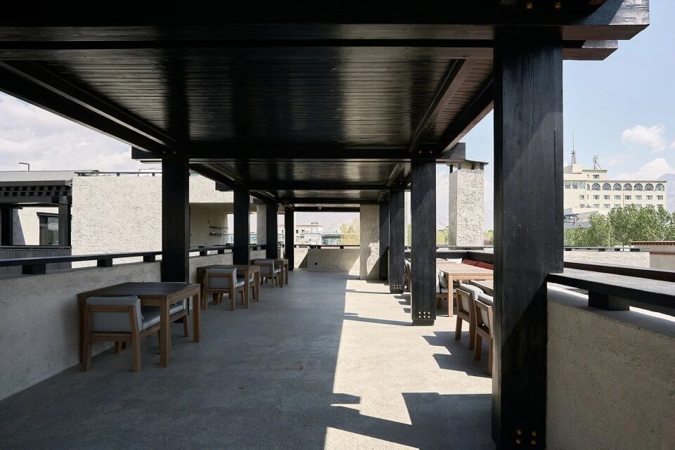 在空间体验方面,这种地面设计在视觉和触感上均展现出高原建筑的粗犷特性,与建筑外立面的质感相呼应。通过对材料质地的精细打磨处理,项目在强调功能性的同时也融入了当地文化元素,表达了对藏地人文与环境的尊重,使建筑从内到外更加贴合当地风土人情,同时具备良好的抗紫外线和耐用性。该建筑不仅考量了环境因素,更是以建造的角度,从材料、形式、功能等多方面对当地历史文化的一种致敬。